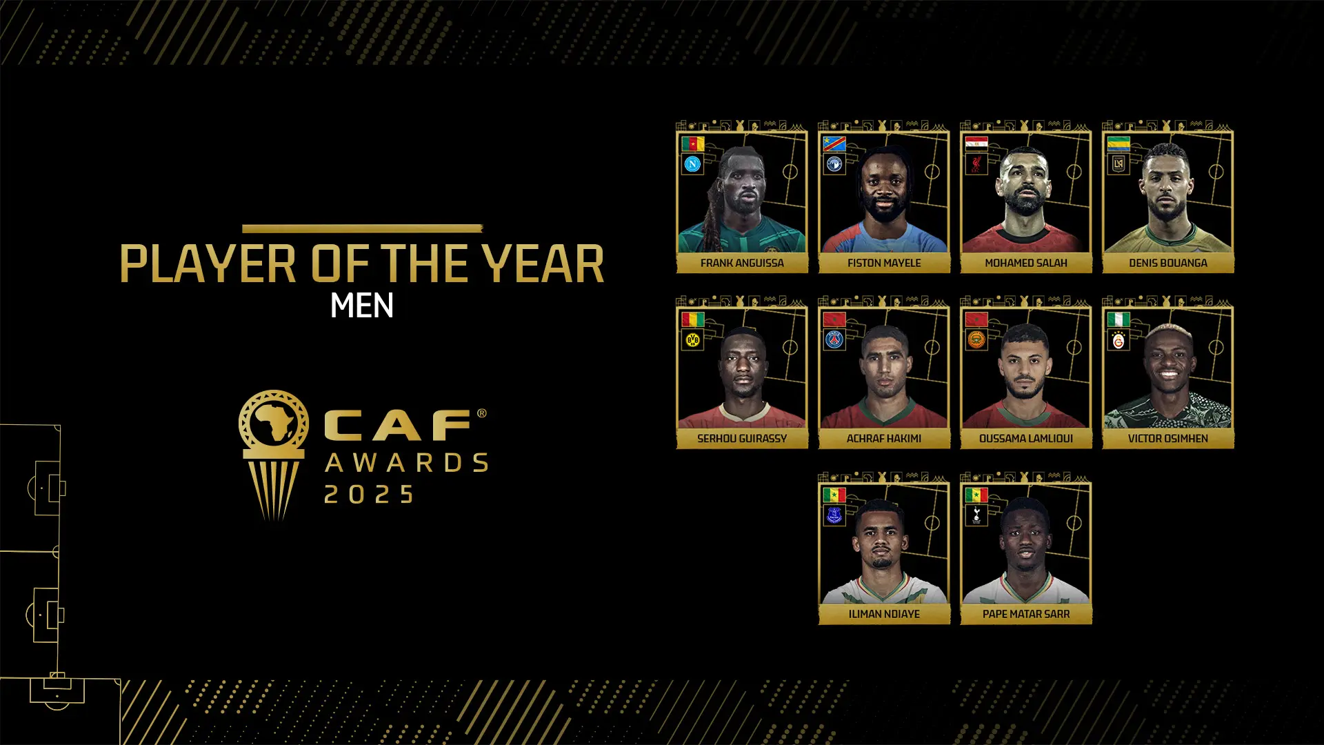 Andre Frank Zambo-Anguissa (Cameroon/Napoli), Fiston Mayele (DR Congo/Pyramids), Mohamed Salah (Egypt/Liverpool), Denis Bouanga (Gabon/Los Angeles FC), Serhou Guirassy (Guinea/Borussia Dortmund), Achraf Hakimi (Morocco/PSG), Oussama Lamlioui (Morocco/RS Berkane), Victor Osimhen (Nigeria/Galatasaray), Iliman Ndiaye (Senegal/Everton), and Pape Matar Sarr (Senegal/Tottenham Hotspur).