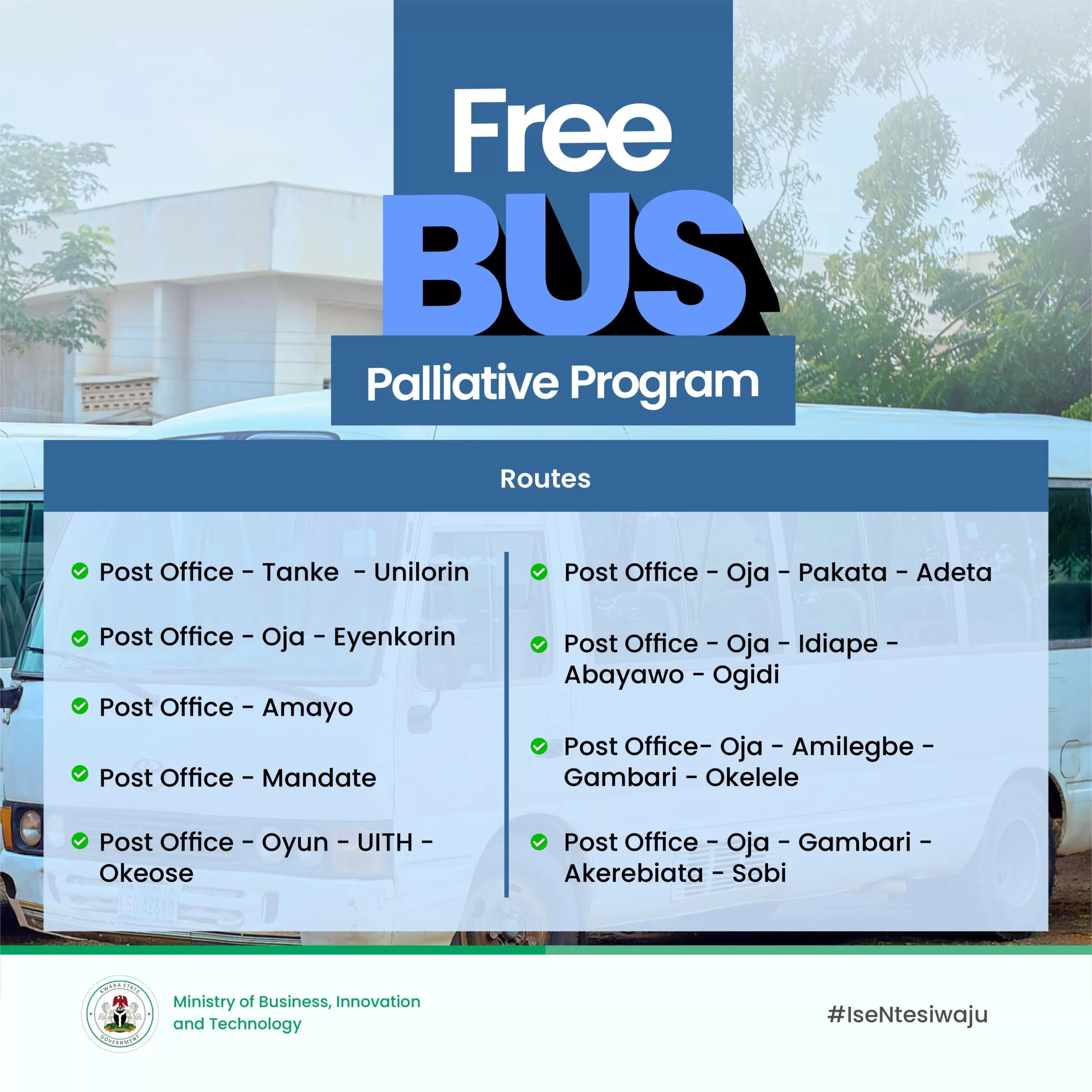 In a recently released price template by the Ministry of Business, Innovation and Technology, the government announced that buses transporting residents from Post Office to Tanke, Unilorin, Oja, Eyenkorin, Amayo, and others will be free.